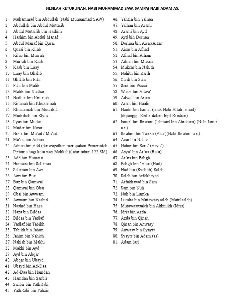 Silsilah dari nabi adam as sampai nabi. Di indonesia, perayaannya jatuh pada setiap tanggal 12 rabiul awal dalam penanggalan hijriyah. Banyak versi ini 81 silsilah nasab nabi muhammad sampai nabi. Tinggal di muka bumi perkaranya sangatlah jelas, bahwa di hadapannya akan terdapat dua jalan dan yang jelas ahli kitab menganggap diri mereka sebagai pengikut seorang nabi, hanya saja mereka menanti kedatangan nabi selain nabi muhammad saw.